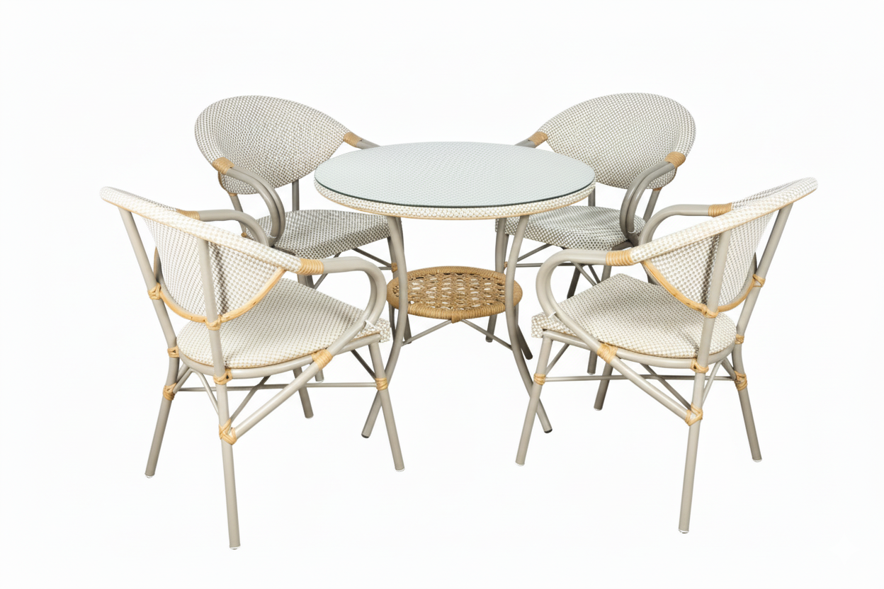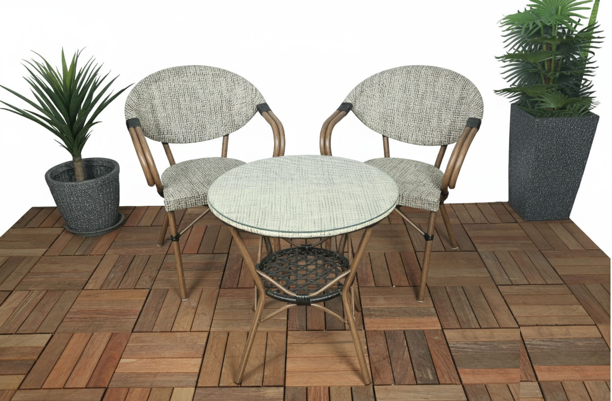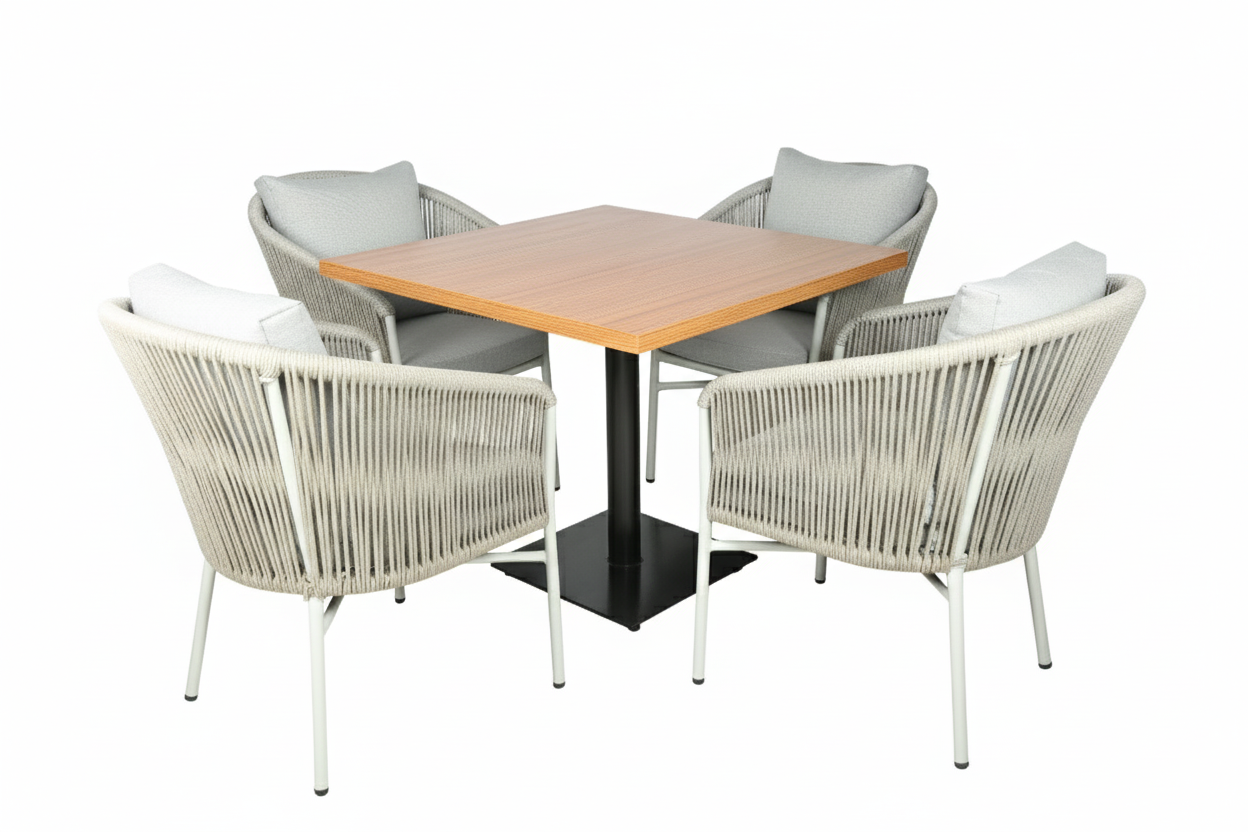 Imported patio dinning set 4+1 The patio dining set is Aluminium powder coated Frame with unique wood material that not only replicates the grain and texture of real wood but also offers enhanced weight-bearing capabilities compared to solid wood. Additionally with a special design, making it more suitable for outdoor use. that is resistant to rust and waterproof or easy cleaning.